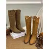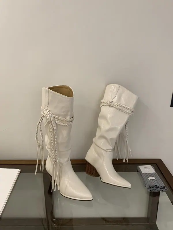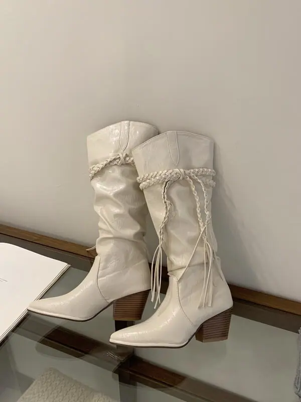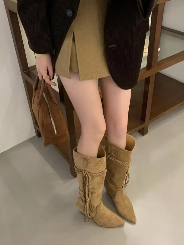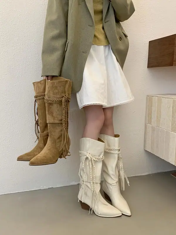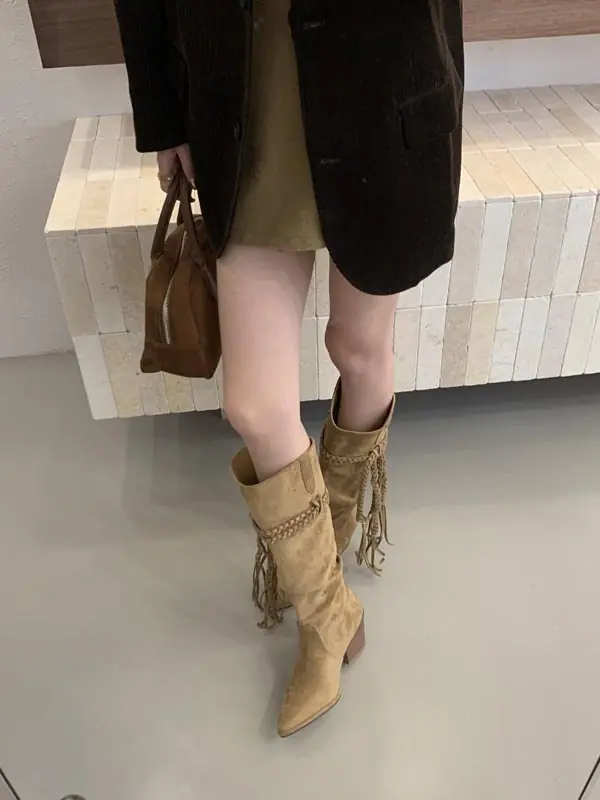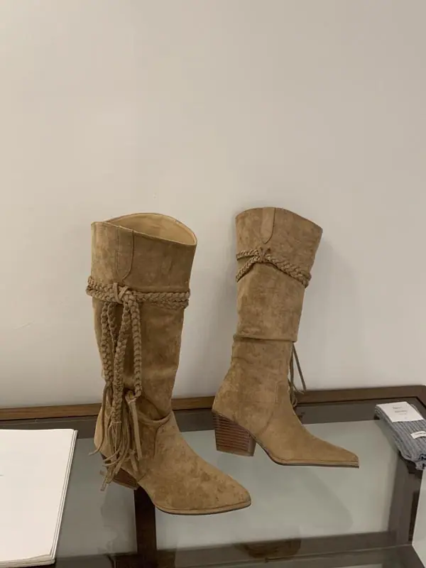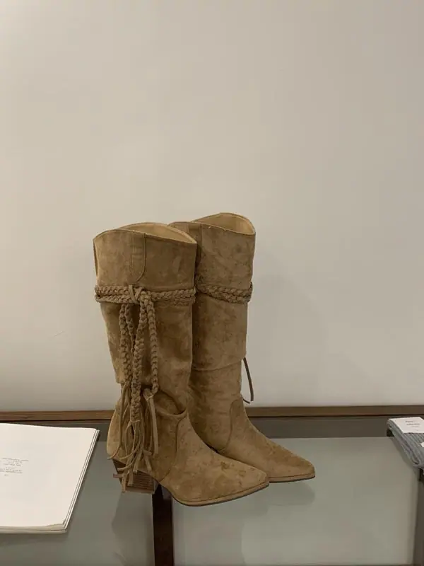 Outono/Inverno 2025 Novas Botas de Cavaleiro de Salto de Madeira Bico Fino Francês Botas da Moda com Franjas Acima do Joelho Salto Grosso Slouchy Botas Western