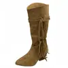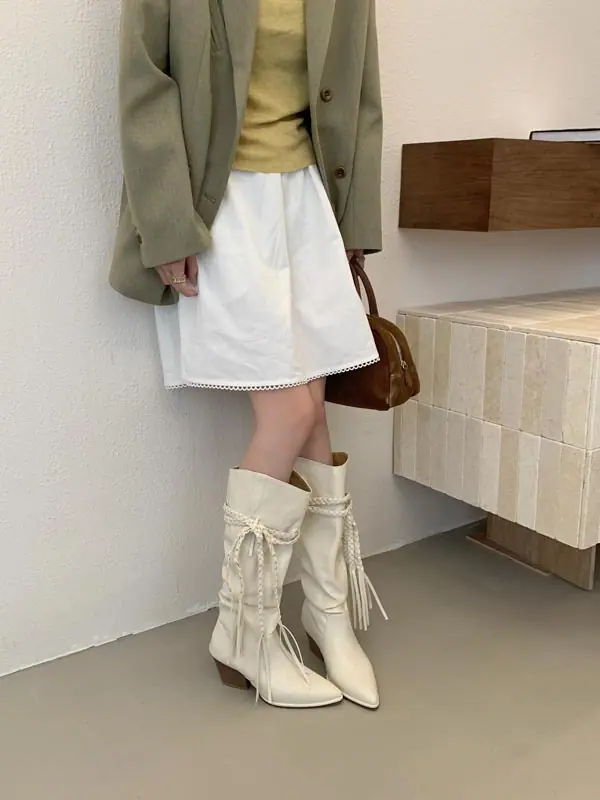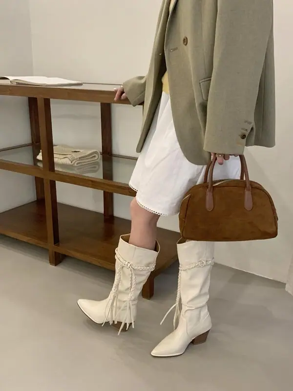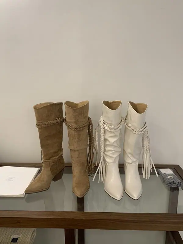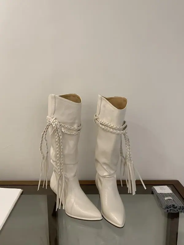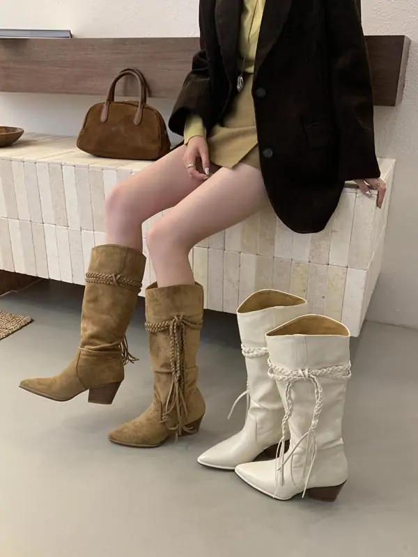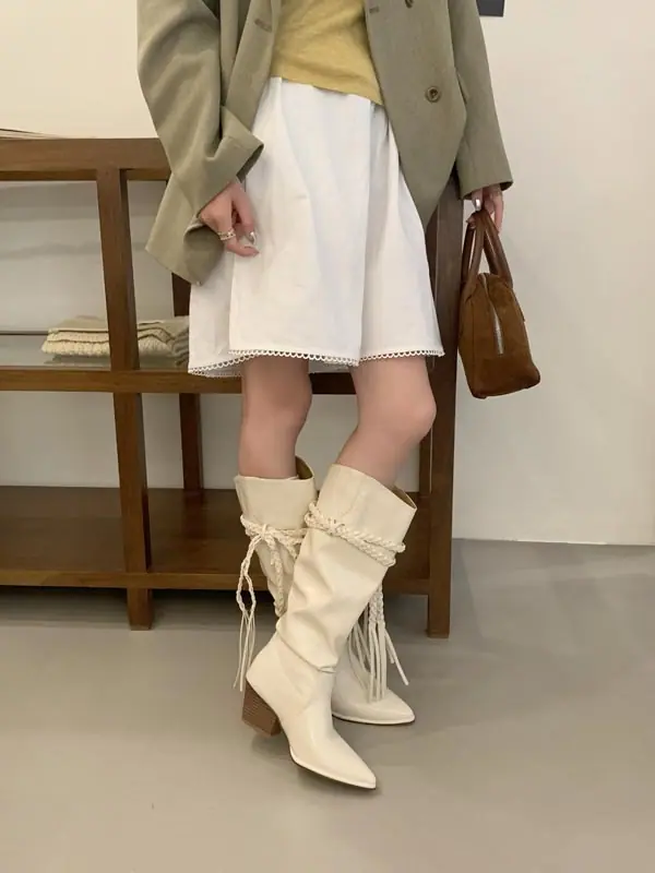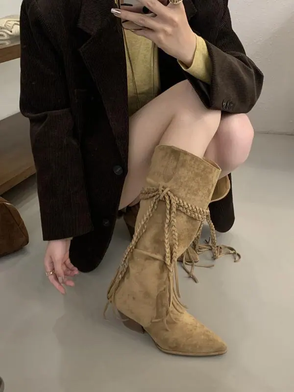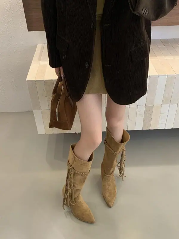 Outono/Inverno 2025 Novas Botas de Cavaleiro de Salto de Madeira Bico Fino Francês Botas da Moda com Franjas Acima do Joelho Salto Grosso Slouchy Botas Western