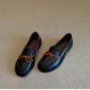 Sapatos Rasos Femininos Confortáveis de Couro Preto Versátil Estilo Francês Retrô Bico Redondo Com Laço Slip-On Para o Dia a Dia