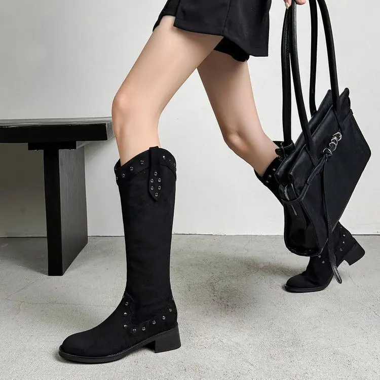 2025 Outono/Inverno Novas Botas Longas Retrô Confortáveis Moda Feminina Versátil Bico Redondo Salto Grosso Zíper Lateral Botas Altas Femininas
