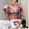 2025 Nova Moda Outono Decote V Estampada Malha Manga Longa Camiseta Aparência Emagrecedora Versátil Camiseta Básica para Mulheres