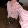 Camiseta Polo Listrada Rosa Doce de Manga Longa para Mulheres Estilo Americano Primavera e Outono Nova Redutora de Idade com um Toque de Sofisticação