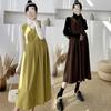 Vestido de Maternidade Conjunto Outono Moda Elegante Solto Cintura Emagrecimento Look Saia Suspender + Blusa de Tricô Gola Alta para Usar por Baixo