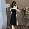 Vestido Francês com Modelagem na Cintura e Saia de Verão com Recortes, Novo Design Nicho Preto e Branco Temperamento Combinação de Cores Saia para Usar por Baixo