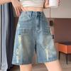 Compre Shorts Jeans Retrô Rasgados Super Populares para Mulheres Verão 2025 Petite A-Line Perna Larga 5 Pontos Desgastados Comprimento Médio no atacado no Joom.pro