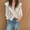 Camisa Feminina Jacquard com Babados, Gola Alta Pequena e Manga Longa de Dongdaemun, Coreia do Sul