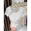 Camiseta Ombro Manga Curta Feminina Verão 2025 Top de Veludo Fino Modelagem Slim Emagrecimento Branco Elegante Combina com Tudo Top A3580