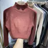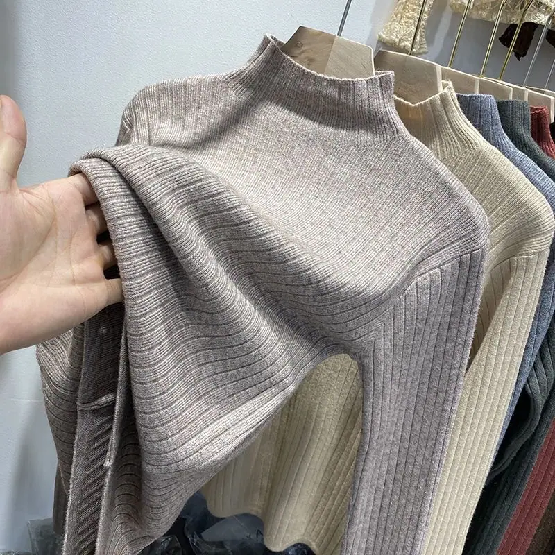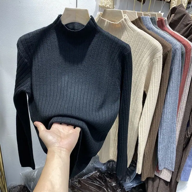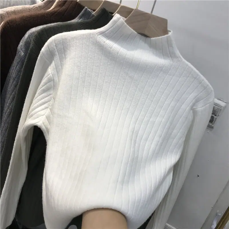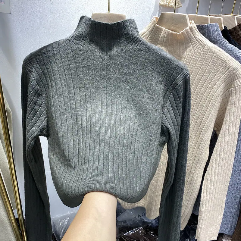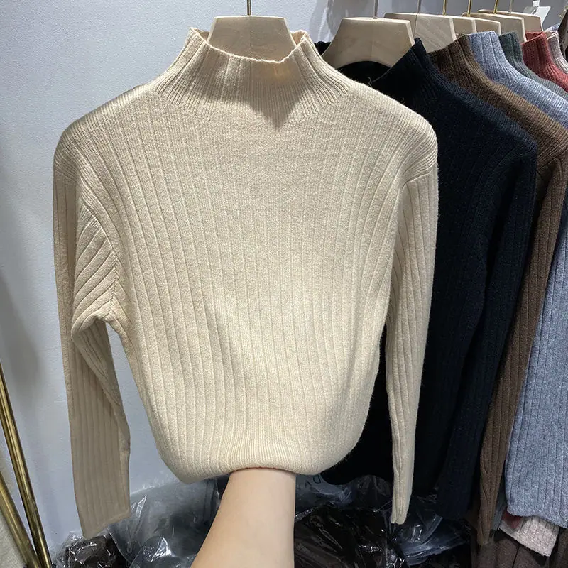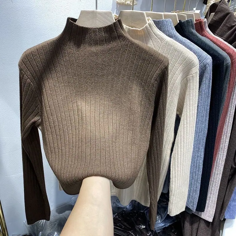Moda Feminina Versátil e Modeladora Gola Média Alta Lã Tricô Camiseta Base Manga Longa 2021 Outono e Inverno Novo Estilo