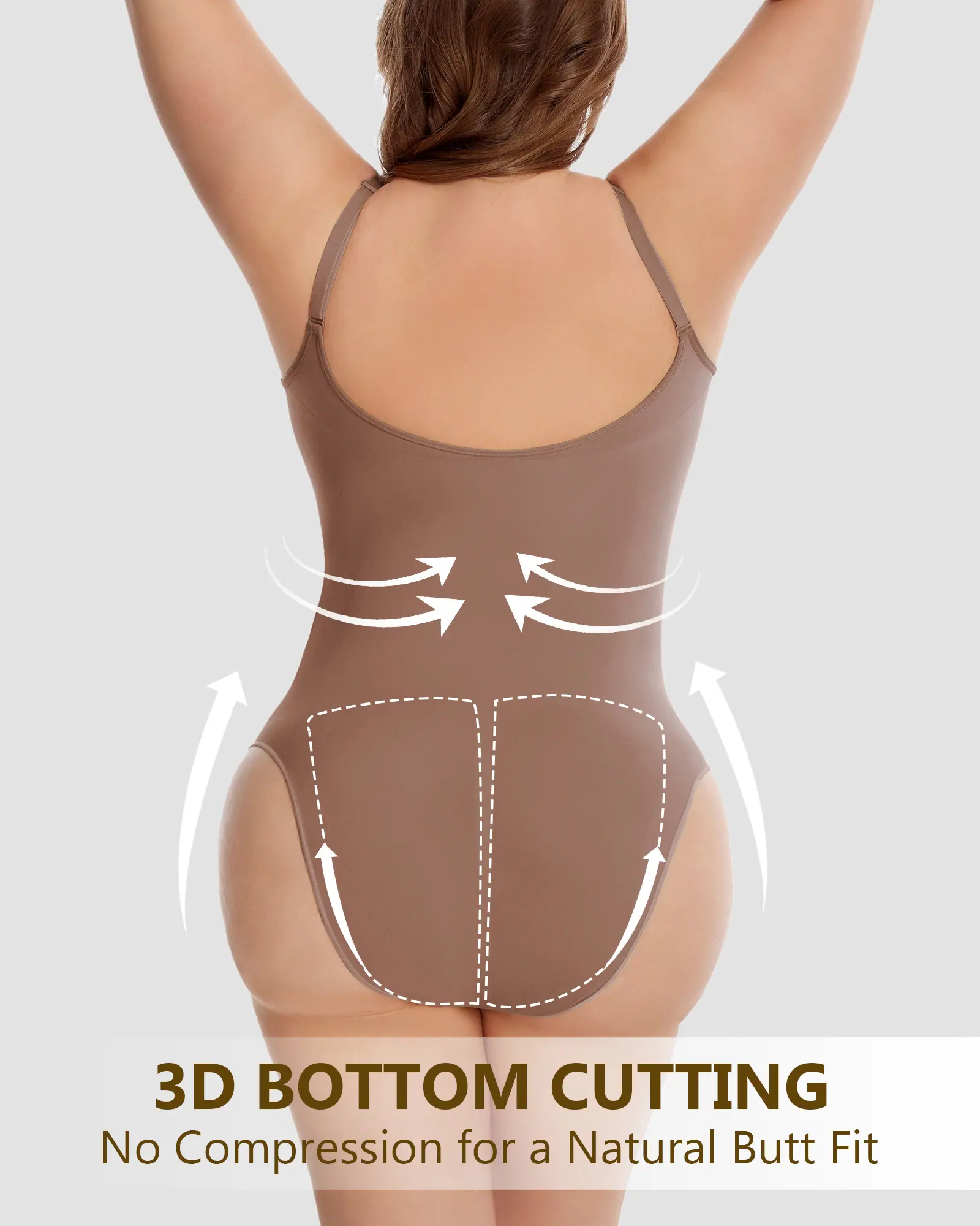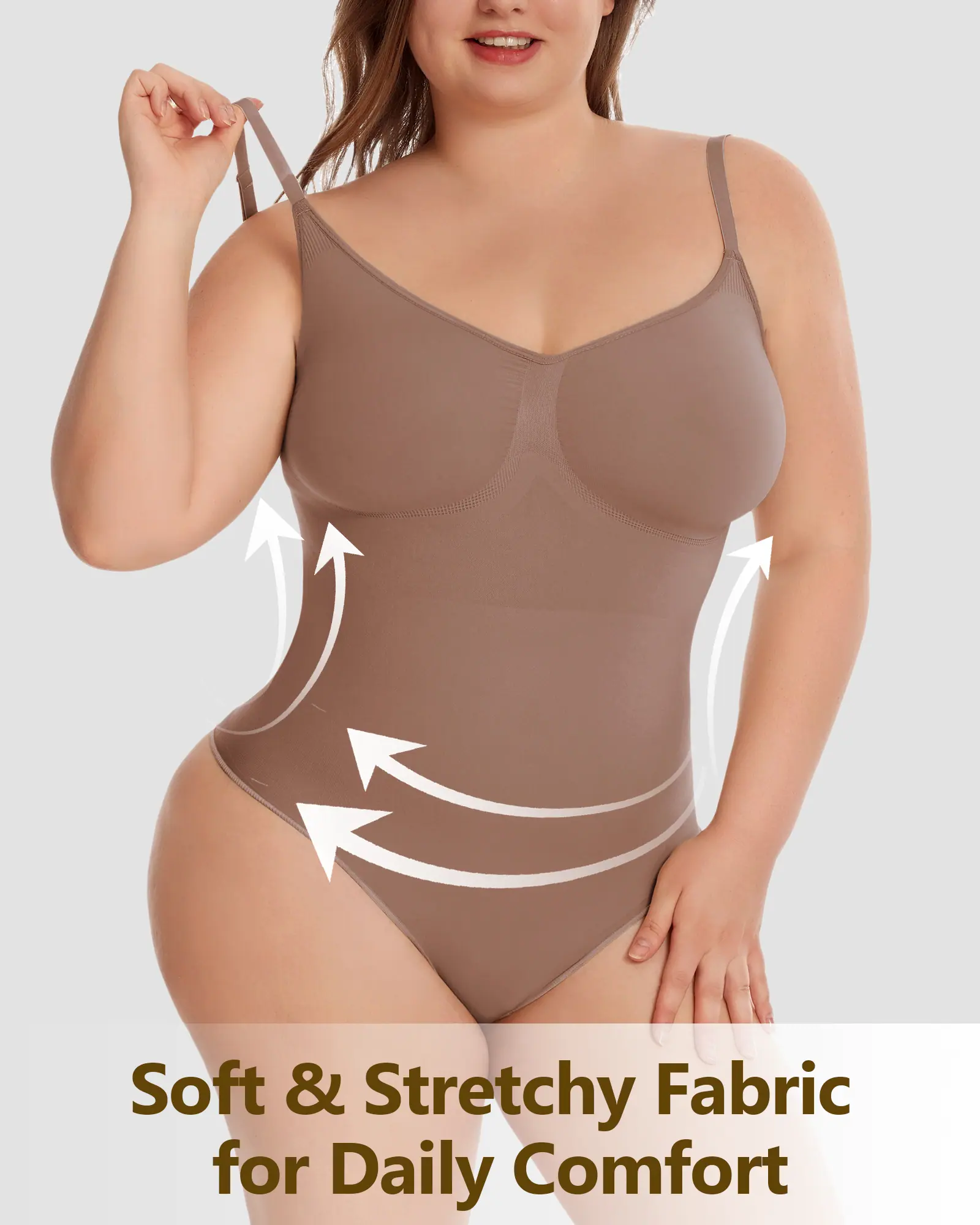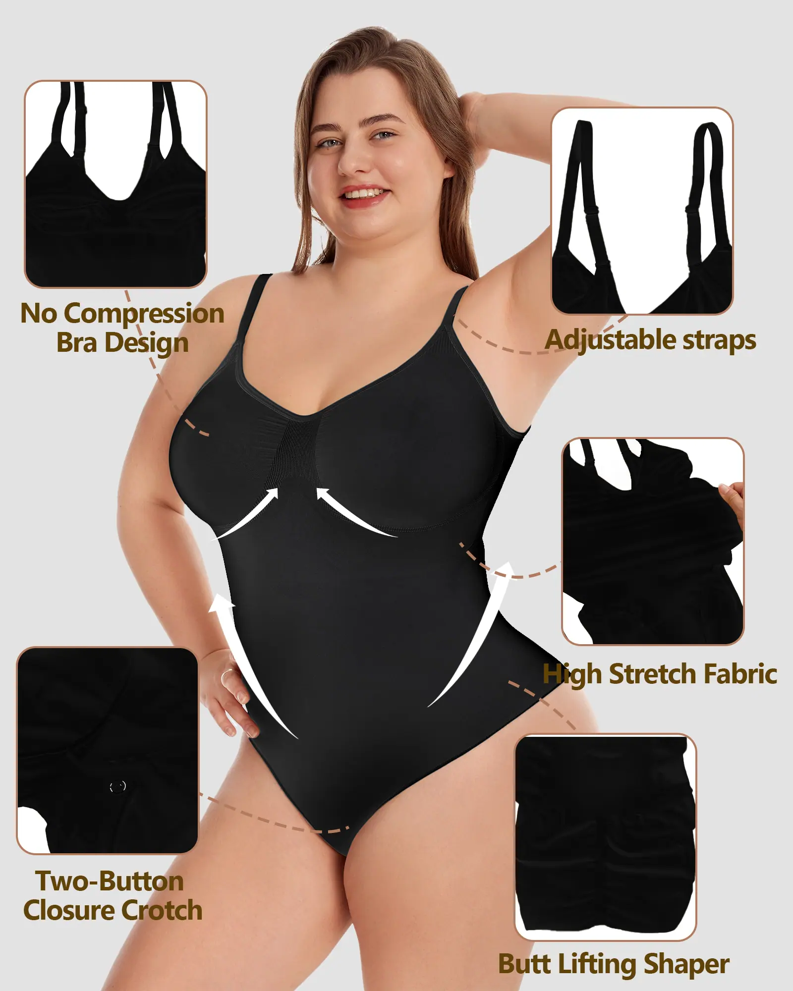 Características de design: Projetada para conforto e curvas, esta peça modeladora com controle abdominal apresenta uma área de busto sem compressão para um formato natural, alças ajustáveis para um ajuste personalizado, um design que levanta o bumbum para realçar suas curvas e um fechamento conveniente com dois botões no entrepernas para fácil acesso ao banheiro.