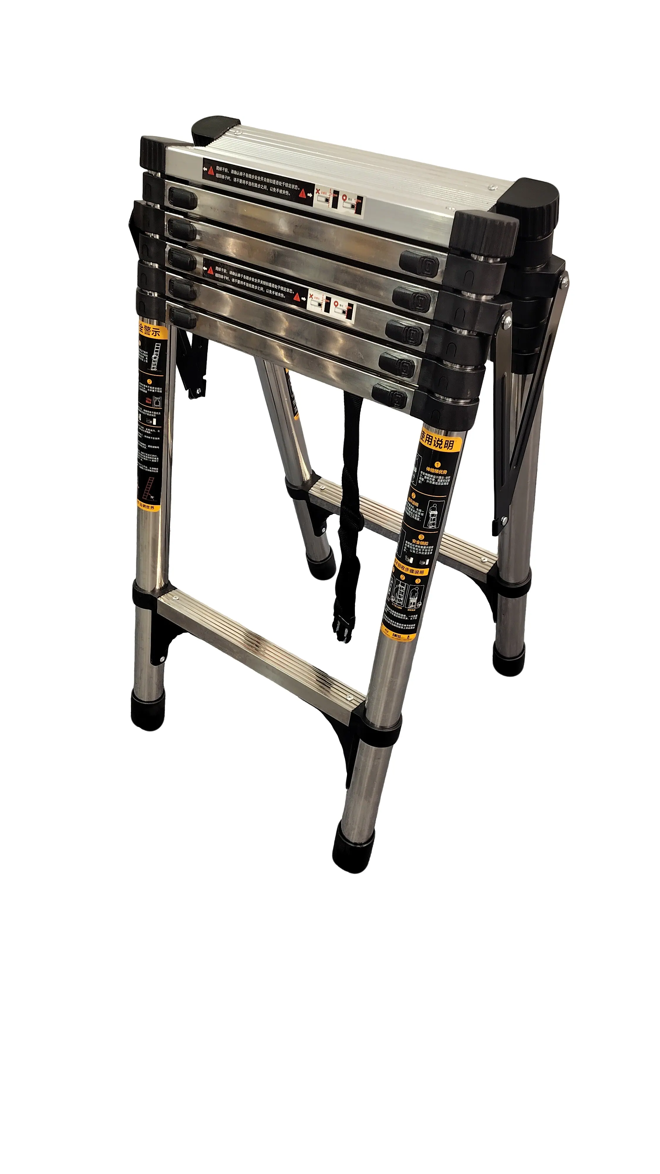 Estrutura e Materiais Feito de material composto de aço inoxidável e liga de alumínio, equilibrando robustez e leveza; design de 7+7 degraus (7 degraus de um lado), suporta ajuste de altura, desdobra-se em uma escada em A, adequado para vários cenários como casa e engenharia.