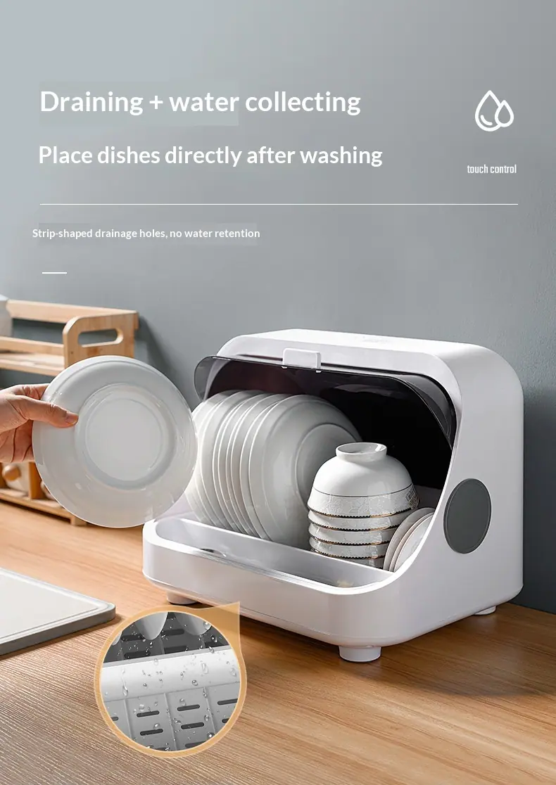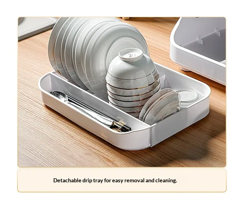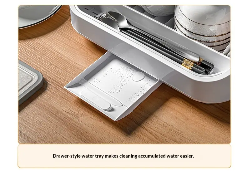 Drenagem eficiente: A parte inferior é equipada com uma bandeja de água removível e um design inclinado de desvio de água para evitar o acúmulo de água e manter a louça seca.