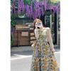 Vestido Europeu e Americano Puro Desejo Retrô Estampado Decote V Alças para Mulheres Verão 2025 Nova Saia de Alças Floral Feminina Exportação