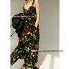 Grande Promoção Estilo Férias na Ilha Estampa de Frutas Contrastante Vestido Longo de Alças Look Emagrecedor Anti-Rugas Saia Longa Drapeada