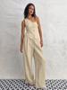 2025 Verão Novo Moda Europeia e Americana para o Dia a Dia Cáqui Ombro a Ombro Algodão e Linho Colete Calças Conjunto de Duas Peças Atacado Roupas Femininas