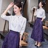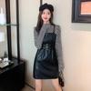 Design de Nicho com Senso de Estilo e Foto Real Retrô Francês Manga Bufante Manga Longa Camisa Base Saia de Couro Vestido de Alça Conjunto de Duas Peças