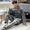 Pijamas masculinos de inverno engrossado quente de três camadas de algodão acolchoado jaqueta coral lã pijamas de comprimento médio terno inverno homewear