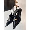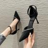 Sapatos Femininos Lianhuaxiang 2025 Sandálias de Salto Alto Bico Fino Francês Tira Preto Microfibra Salto Alto Salto Agulha
