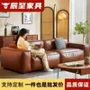 Sofá de couro de cera de óleo vintage Nebula Sala de estar antiga Apartamento pequeno Três pessoas Sofá de couro italiano minimalista reto