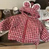 Roupa Infantil Estilo Coreano 2025 Novo Casaco de Inverno para Meninas com Orelhas de Coelho Casaco com Capuz Xadrez Espesso de Lã Infantil Tendência