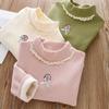 Camiseta Base Grossa Forrada com Fleece para Meninas Outono e Inverno Novo Estilo 2025 Gola Meia-Alta Renda Quente Fleece Integrado Camiseta Atacado