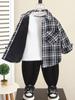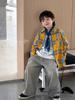 Coelho Travesso 2025 Outono Novo Masculino Xadrez Dopamina Jaqueta para Crianças Maiores com Bordado de Letras e Gola Reversível Camisa Infantil Tendência