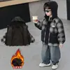 Parka Jeans Xadrez Forrada com Fleece para Meninos Estilo Coreano Casaco de Algodão Grosso Estiloso para Meninos Jovens