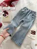 Jeans de Primavera e Outono para Meninas Bebê Elegante Infantil Moderno Versão Coreana Fashion Retrô Desfiado Solto Calças de Perna Larga