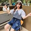 Conjunto de Verão para Meninas Estilo Coreano Roupas Infantis Jeans com Listras Manga Curta Roupas de Verão para Meninas Casual Versátil Tendência