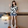 Camiseta de verão para meninas, manga curta, estilo ocidental, infantil, distinta, moderna, estilo coreano, floral, franjas nas orelhas, celebrante da internet, top moderno