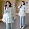 Moda Gestante 2026 Primavera Novidades Estiloso Fresco Solto Cobertura Barriga de Grávida Conjunto Simples de Camiseta + Colete de Renda