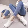 Em estoque Calça jeans feminina grávida, jeans micro elástico alto, primavera e outono, calça casual, jeans feminino grávida para uso externo