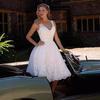 Vestido de Noiva Europeu e Americano de Exportação com Renda Curta Vestido de Noiva em Tule com Strass Decote em V Ajuste por Cadarço Vestido Retrô