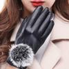 Guantes de invierno cálidos con bola de pelo de PU para conducir, directos de fábrica, para mujer, con pantalla táctil, cálidos guantes de piel de conejo de terciopelo.