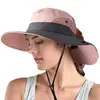 Chapéu de Sol de Verão Feminino com Corda à Prova de Vento, Chapéu de Praia com Aba Larga, Chapéu de Pescador Dobrável com Tela para Proteção Solar e Abertura para Rabo de Cavalo