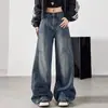 Jeans Wide Leg Retrô Solto de Início de Primavera Estilo Americano para Mulheres com Bainhas Largas, Calças Retas Drapeadas de Cintura Alta Escuras Comprimento Total