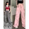 Macacão casual americano retrô hip-hop feminino reto solto cintura alta emagrecimento multi-bolso esportes calças casuais