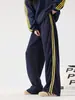Calça Esportiva Listrada para Mulheres no Outono e Inverno Aconchegante Reta de Perna Larga com Elástico na Barra Calça Casual para Mulheres Cintura Alta Calça Americana de Perna Larga
