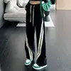 Calça Esportiva Casual Preta Estilo Coreano Nova para Primavera/Verão 2026 para Mulheres, Color Block, Cintura Elástica, Cordão, Perna Larga, Comprimento Total