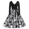 Real shot 20.22 milhões Halloween Skull Print V-neck Queimado Flor Manga Comprida Grande Vestido Swing com Fita