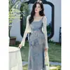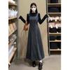 Conjunto de Vestido de Suspensório Retrô Francês para Mulheres, Camisa de Fundo de Manga Comprida para Outono e Inverno, Saia Longa em A, Conjunto de Duas Peças com Contas para um Visual Slimming