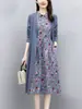 Vestido de Algodão e Linho Primavera e Outono Novo Floral Saia Midi Jaqueta de Manga Longa Conjunto Elegante Emagrecedor Conjunto de Duas Peças