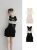 Terno de Três Peças Moda Elegante~Sexy com Gola Volumosa de Suspensório + Cardigã Feminino + Saia de Dongdaemun, Coreia do Sul