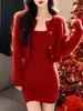 Vestido Jaqueta Cardigan Tricotado Vermelho de Alta Qualidade Ano do Zodíaco Conjunto de Duas Peças para Mulheres Usarem no Outono e Inverno