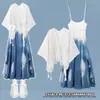 Conjunto Elegante de Verão Plus Size para Mulheres Estilo Étnico Xale Recortado Tie-Dye Azul Vestido de Alça Redutor de Idade Conjunto de Duas Peças