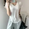 Camiseta de Manga Curta Branca Slimming de Verão Nova de Alta Qualidade Imitação de Algodão para Mulheres Decote V Solta Roupa Externa Moda Irregular Top para Mulheres