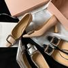 Sapatos Femininos Mary Jane Estilo Delicado com Laço Prata Modelo Novo 2026 com Uma Tira Única, Bico Baixo, Sapatilhas de Salto Bloco Estilo Francês