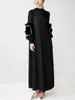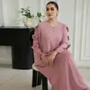 Vestido Plissado Elegante Estilo Árabe para Mulheres Muçulmanas 2024 Cor Sólida Gola Redonda Manga Longa