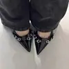 Sapatos Pretos de Salto Alto para Mulheres com Design de Nicho e Rebites Elegantes de Senhora Verniz Salto Gatinho com Tiras de Fivela e Sandálias de Biqueira
