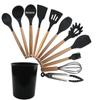 Conjunto de utensílios de cozinha de silicone de madeira 11 peças Conjunto Faia Cozinhar Pá Colher Spiller Assar 12 Peças Set com balde de armazenamento
